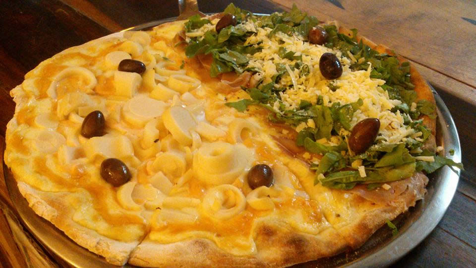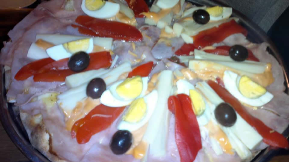 Salsa de Tomate, Muzzarella, Jamón, Morrones, huevo, Palmitos, Salsa Golf y Aceitunas.