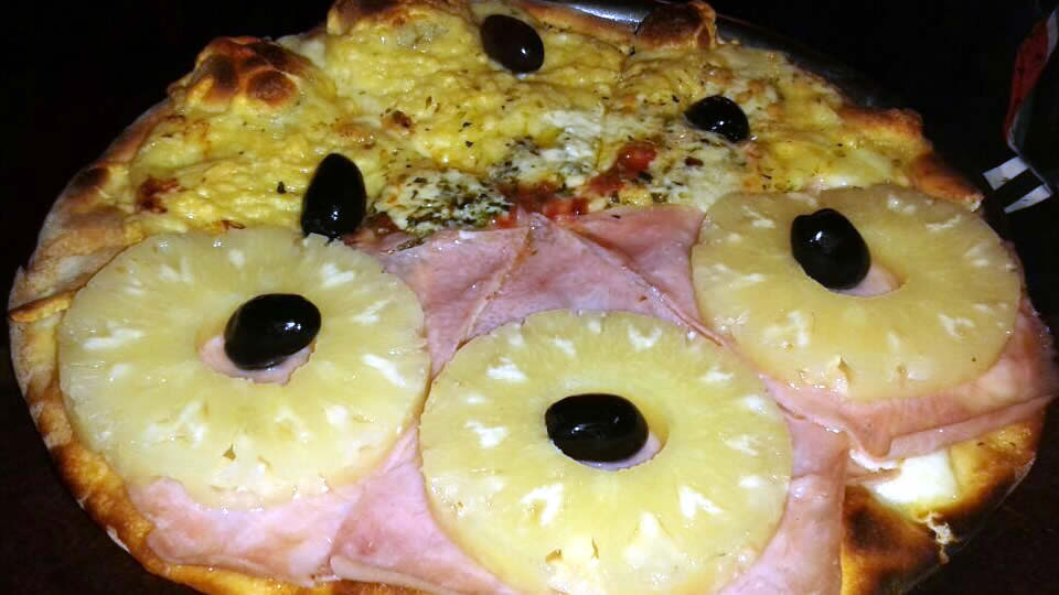 Salsa de Tomate, Muzzarella, Jamón y Ananá.