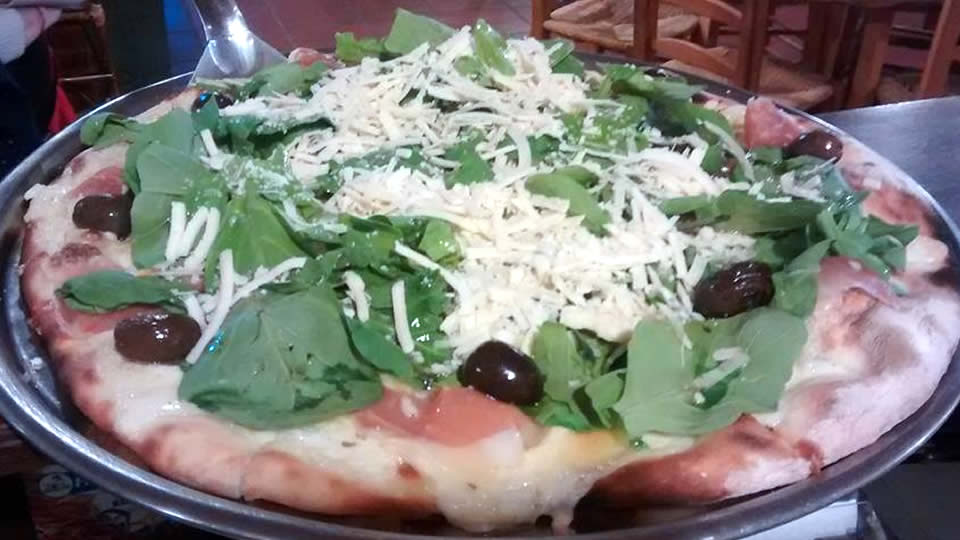 Pizza a la piedra elaborada a la vista en horno a leña.